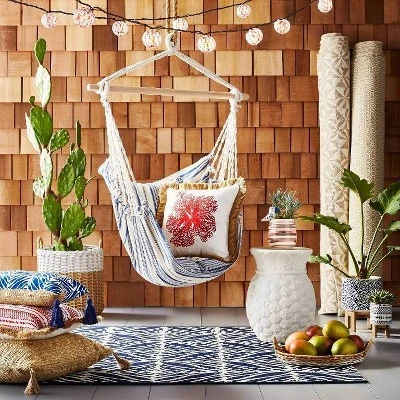 Add bohemian charm to your entryway or outdoor seating space with the Geo Outdoor Rug from Threshold™. Featuring a bold diamond geometric print on a beige background, this decorative outdoor rug adds dimension and style to your space. Strengthened with latex backing, this outdoor rug is ideal for placing on your patio, porch or entryway for function and flair.