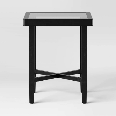 Create a cozy conversation area in your outdoor space with this Searsburg 3-Piece Aluminum Patio Chat Set in Black from Threshold™. Made from black weather-resistant, powder-coated aluminum, this set is composed of two club chairs and a square, glass-topped accent table. The club chairs are padded with 100% polyester cushioned seats and backrests that are covered in white fabric for contrast and comfort.