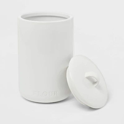 Maintain a modern, stylish kitchen by adding this Stoneware Hand Lettered Canister from Threshold™. Made with stoneware, this canister features a cylindrical shape and comes with a ceramic lid to help keep the contents — whether it’s flour, coffee or anything else — nicely stored. The top handle on the lid makes it convenient for you to lift and take out the contents, while the hand-lettered text makes it easy to find among other containers. This white canister will easily blend with your existing kitchen decor and should be hand washed.